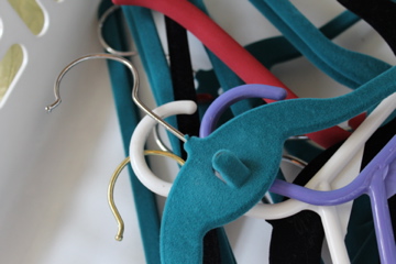 - Now…working your way backwards (from your favorites to the front of your closet), take ten seconds for each non-favorite item and decide to either donate, alter or sell. Notice one of the choices here is not “Keep.” That was Step 2. We’ve moved on. We’re in Step 3 now. This is your moment to seize, to step up and be brutal. It’s not the time to remember when you bought it or where you wore it or who you were with when you got red sauce on the cuff. This is the time to recognize that THIS PIECE OF CLOTHING IS NO LONGER YOUR FAVORITE. Take it off of the hanger, say goodbye and put it in a Donate, Alter or Sell container. Put the hanger in the Hanger container. Done. The first couple of items you do this with will feel liberating. The key is to stay with it and maintain momentum. Ten seconds for each item will go quickly. In 30 minutes, you can get through 180 articles of clothing this way! SIDE NOTE: We also took the time to remove our least favorite hangers from the bunch (see picture below). These evil little buggers bother us to no end – they’ve got a little tabby thing on the front. The tabby thing is great for ribbons that keep our clothing straight on the hanger, but we also discovered that it just hooks onto the hanger next to it, wreaking all kinds of havoc when trying to pull down one piece of clothing. So we said bye-bye to these suckers in today’s purge.