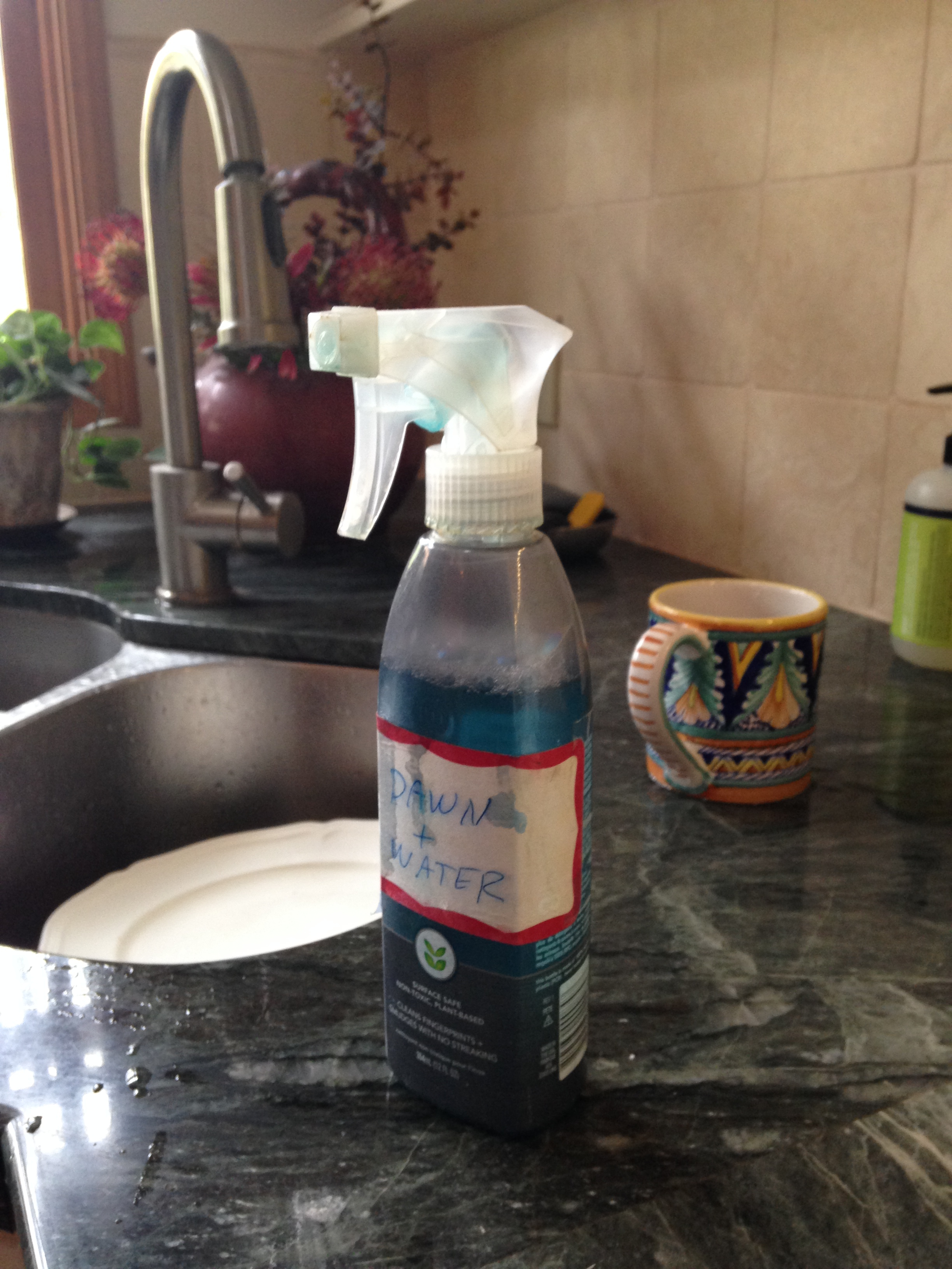 So I got very excited when I spied this clever solution while visiting my Aunt Laura. (Check out that gorgeous quartzite countertop while you’re at it – it’s indestructible). She just took an old Method spritz bottle, filled it with equal parts Dawn and water to make a spray-able dish soap. Lightweight, easy to grip and dispenses just the right amount. We had to pass the tip along!